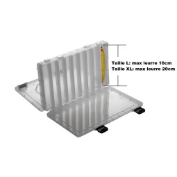 Taille L: -14 compartiments -max leurre 16cm Taille XL : -18 compartiments -max leurre 20cm